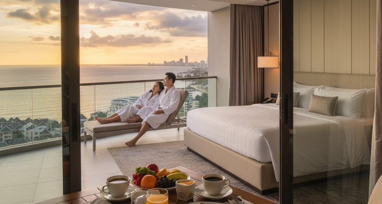 Experience ultimate luxury with our Executive Serenity Escape (3 Days/2 Nights). Stay in our spacious Executive Deluxe Suite with Sea View and enjoy a relaxing balcony sunset. This package includes complimentary set breakfast for two (2), a $500 dining voucher, and guaranteed late check-out at 1 PM. The perfect high-end staycation!