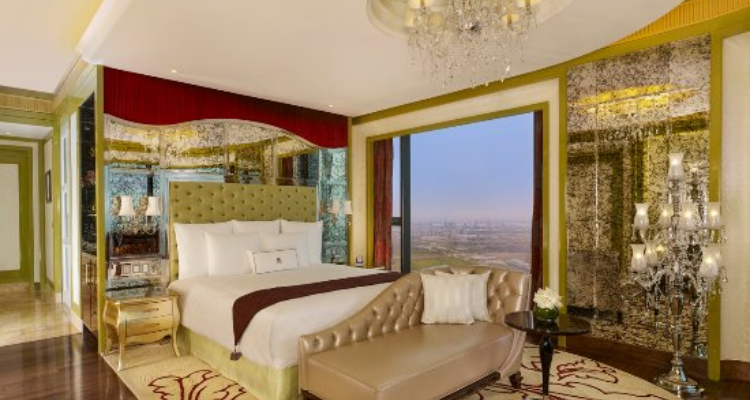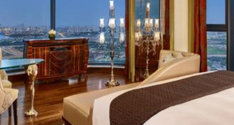 The Zephanie Room offers a relaxing stay in the Heart of Dubai Marina combining comfort with a touch of elegant style.This spacious decor a stylish seating area with a leaather chaise lounge provides a perfect spot for unwiding while large floor to ceiliing windows fill the space with natural light and offer a wide city view.