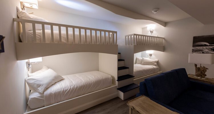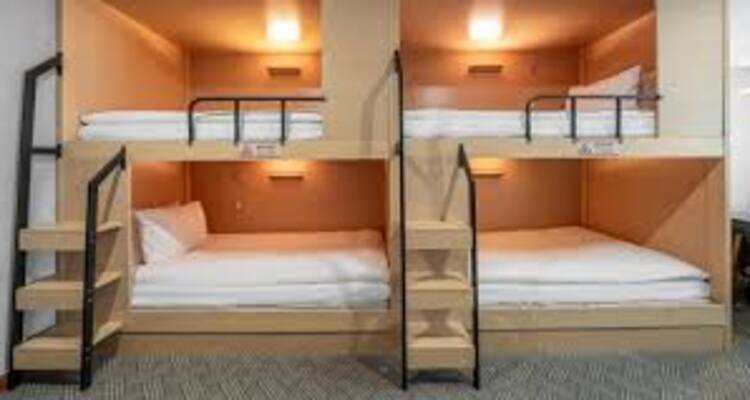 Family & Barkada Bedroom Unit, 4 Bunk Beds up to 8 guests, with one large shower room, two cabinets, and tables and chairs.