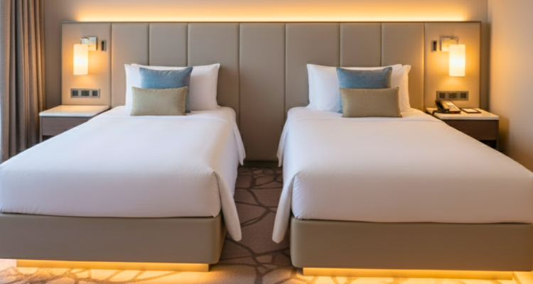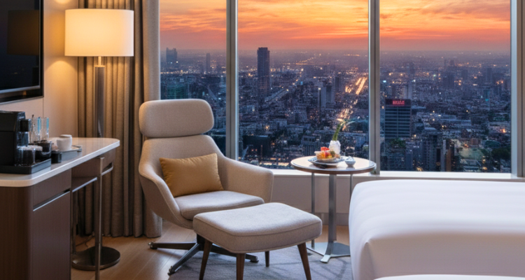 Our Skyline Deluxe Room offers generous space and elevated comfort for families or groups. Enjoy two cozy queen beds, a private bath with a relaxing bathtub, and premium in-room amenities including a mini bar and complimentary breakfast. Guests can unwind while enjoying beautiful city views and full access to hotel facilities such as the gym and wellness area. Perfect for guests seeking both comfort and a touch of luxury.