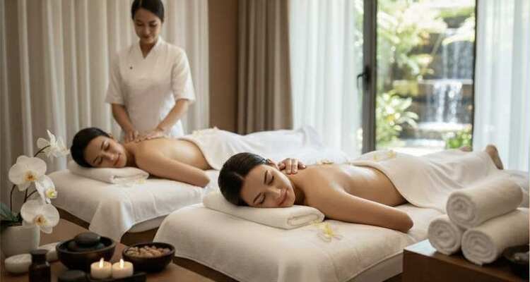 Indulge in a full-day pampering experience designed for ultimate relaxation and connection. Begin your day with a soothing herbal steam therapy to refresh your senses, followed by a detox body wrap and a rejuvenating hot stone massage. Enjoy a light gourmet lunch served with calming herbal tea, then unwind together in a private couple’s bath surrounded by soft candlelight and aromatic oils. End the retreat with a glass of champagne and complimentary scented gift set to take home.