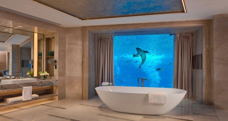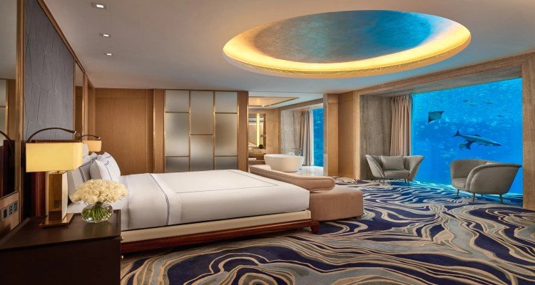 This extraordinary underwater suite offers a truly unique and luxurious stay, where the wonders of marine life unfold right outside your window. The room features expansive floor-to-ceiling glass walls that provide breathtaking underwater views, immersing guests in a tranquil oceanic atmosphere.