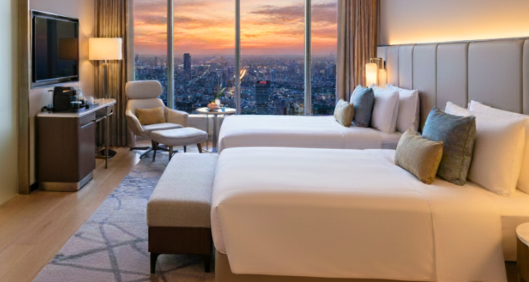 Our Skyline Deluxe Room offers generous space and elevated comfort for families or groups. Enjoy two cozy queen beds, a private bath with a relaxing bathtub, and premium in-room amenities including a mini bar and complimentary breakfast. Guests can unwind while enjoying beautiful city views and full access to hotel facilities such as the gym and wellness area. Perfect for guests seeking both comfort and a touch of luxury.