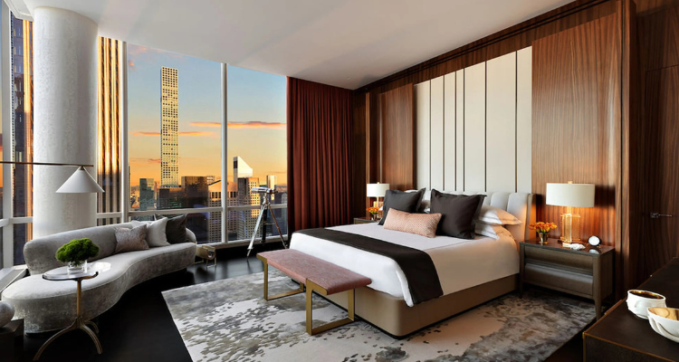 This luxurious modern bedroom features floor-to-ceiling windows offering a stunning panoramic view of a city skyline at sunset. The space combines elegance and comfort with warm wooden wall panels, plush bedding in neutral tones, and stylish accent furniture. A curved velvet chaise lounge sits near the window, perfect for relaxing and enjoying the view, while a contemporary rug and soft lighting create a cozy, inviting ambiance. The room also includes a telescope for stargazing and a chic blend of textures and colors, giving it a refined, high-end atmosphere.