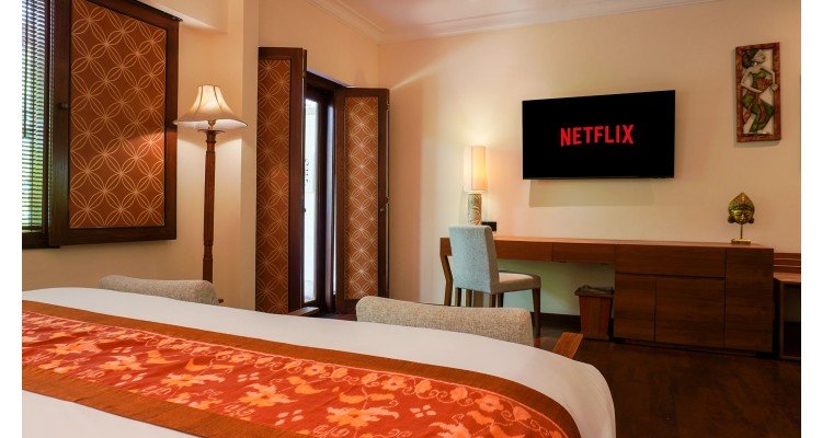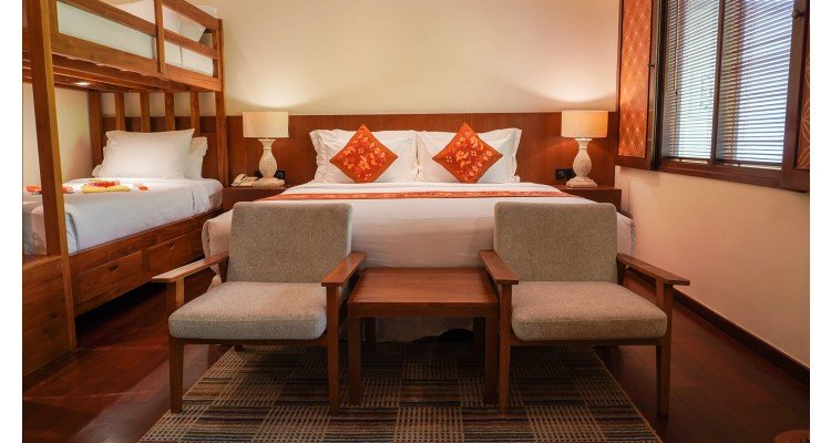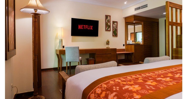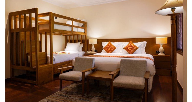 The ideal home base for your family's Bali adventure. This spacious room features a comfortable Queen-sized bed for parents and a beautifully crafted, custom-made wooden bunk bed for children (sleeps two). Enjoy the rich Balinese wood decor, large TV with Netflix access, and a private patio that opens up to the resort's lush gardens.