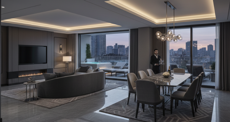 The Presidential Suite offers an unmatched experience with a private balcony, Jacuzzi, dining area, and personalized butler service. Designed for distinguished guests who desire exclusivity and grandeur.
